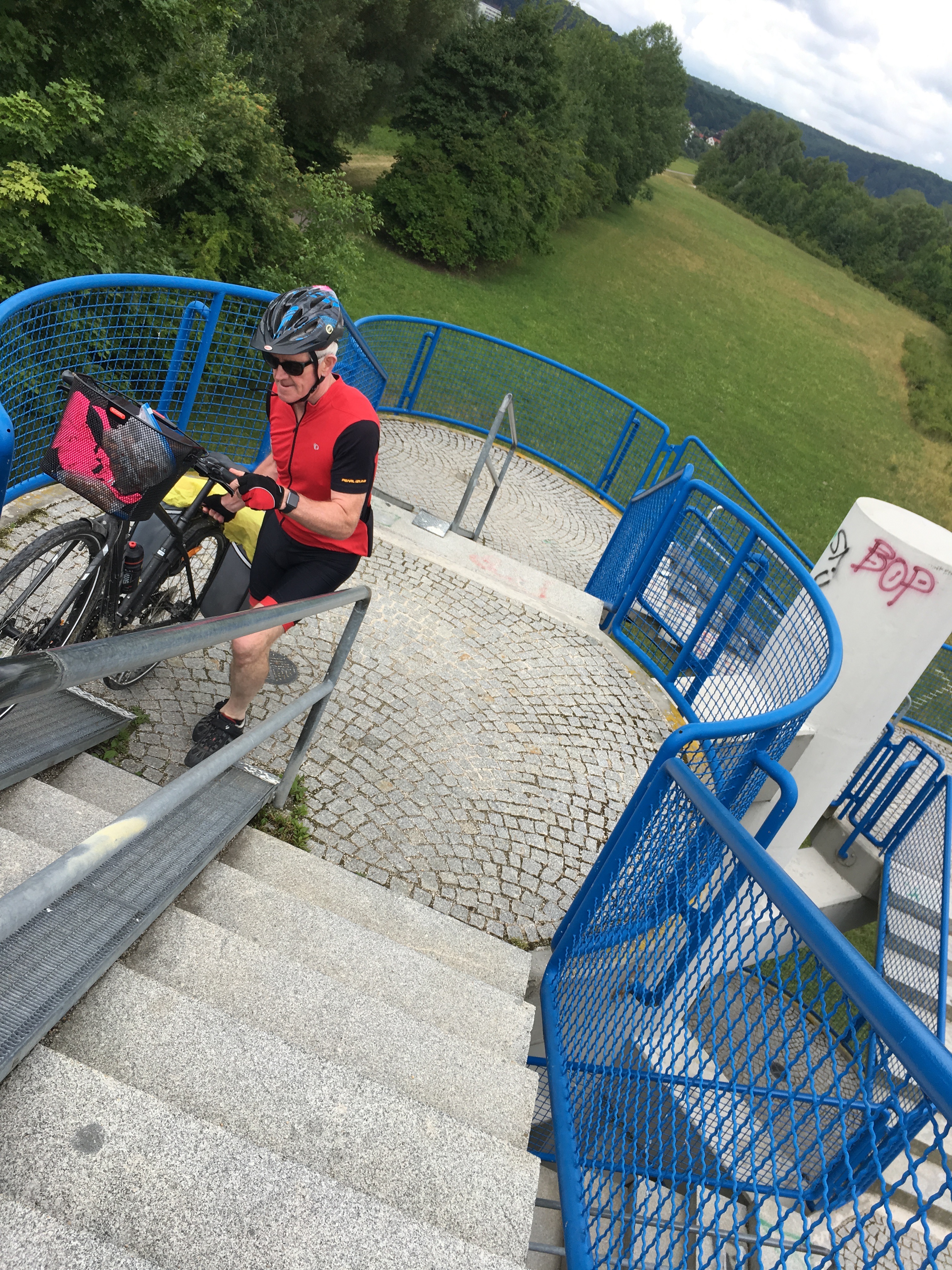 At one point we made a mistake and had to get the bikes up over a pedestrian bridge